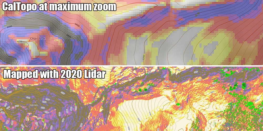 NOTE: CalTopo does use high resolution USGS lidar to compute relief and slope shading in some places, but coverage is also spotty. Also, they do not currently use this data for contour lines or for showing surface features.